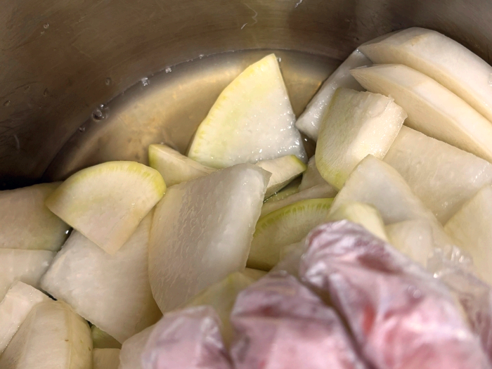 4. 30분 후 절이는 중간에 볼 안의 무를 아래쪽과 위쪽을 한번 뒤적여 섞어주세요. 벌써 수분이 많이 나왔죠?