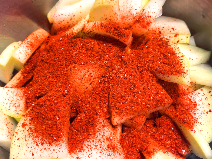 8. 물을 뺀 무는 먼저 준비한 고춧가루를 넣어 버무려 색을 빨갛게 물들여줍니다.