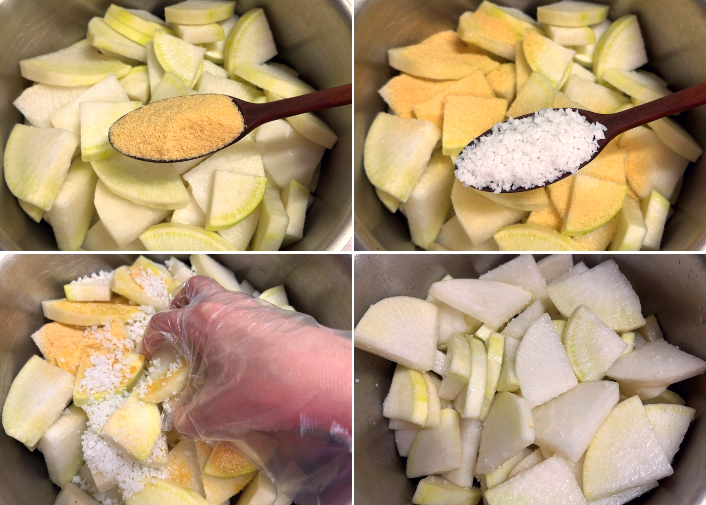 3. 썰어준 무는 볼에 담아 준비한 굵은소금과 설탕에 버물여 절여 줄게요. 1시간 정도면 거의 절여진답니다.