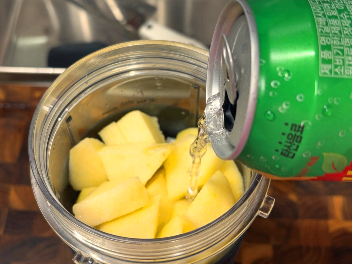 7. 무에서 물이 빠지는 동안 양념을 준비할게요. 고춧가루를 제외한 양념재료 양파, 사과, 새우젓, 멸치액젓, 생강청, 다진 마늘, 찬밥, 사이다를 모두 믹서기에 갈아 준비해 줄게요.