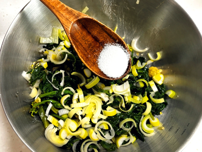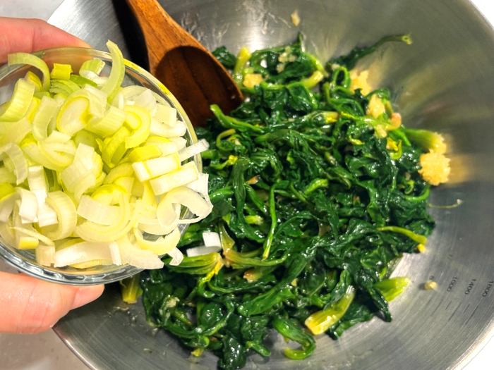 8. 수분을 제거한 시금치에 준비한 다진 마늘, 참기름, 소금, 그리고 썬 대파를 넣어서 조물조물 무쳐주세요.