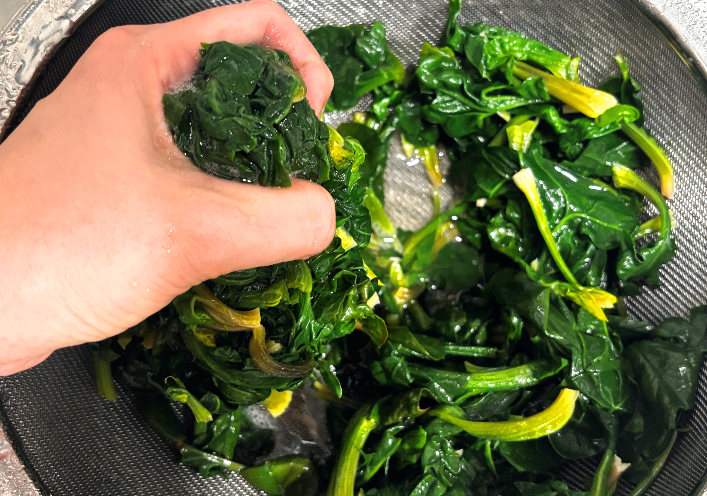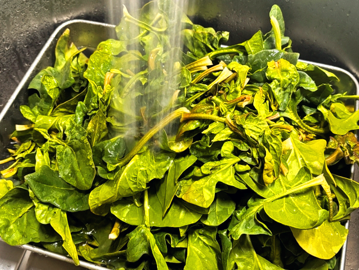 6. 찬물에 한번 헹구어준 섬초를 건져서 손으로 물기를 꽉 짜서 제거해 주세요.(수분을 완전히 잘 제거해 주셔야 무친나물에 물이 생기지 않아요, 꽉 짜주세요!)