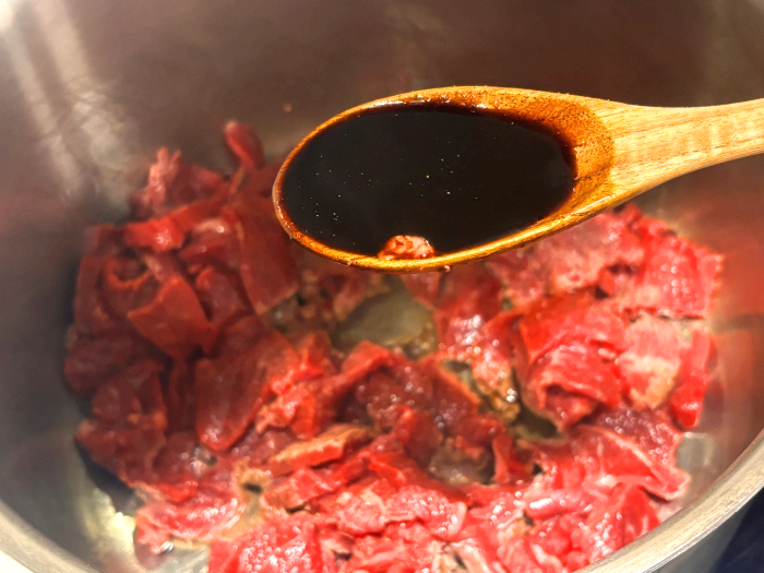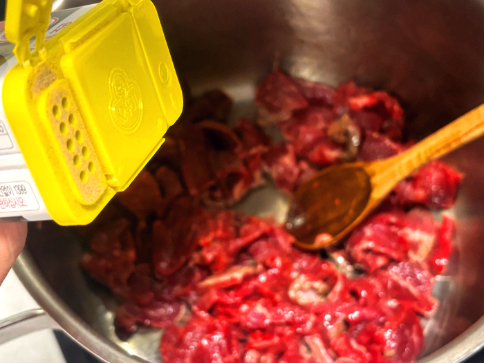 6. 예열된 냄비에 썰어 준비해 놓은 소고기를 넣어 볶아주세요.