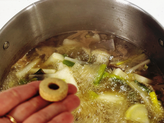 13. 중간중간 국이 끓어오른 후 윗면에 떠오르는 거품은 걷어내주시면 깨끗한 국물이 된답니다. 마늘을 넣고 한소끔 끓이고 나면 한번 더 거품이 떠 오를 거예요, 깨끗하게 건져내셔도 좋아요.