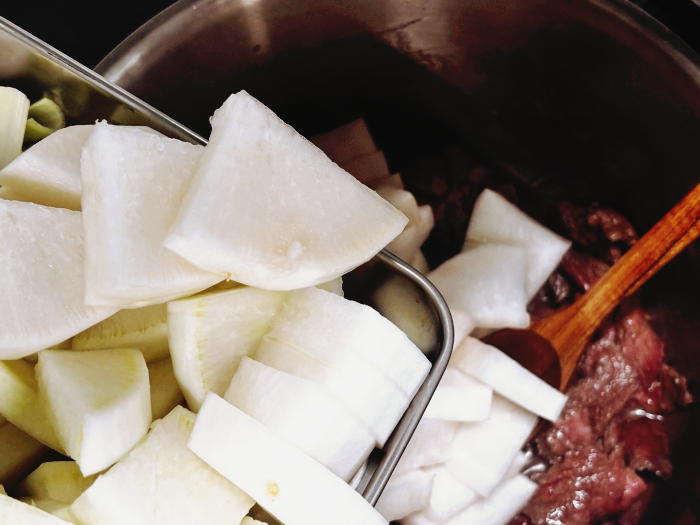9. 소고기의 겉면이 살짝 익으면 썰어 준비한 무를 넣어서 한번 더 볶아주세요.