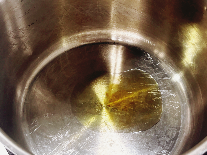 먼저 냄비에 식용유 1큰술과 참기름 1큰술을 넣어 예열해 주세요.