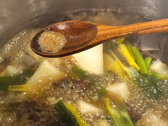 13. 중간중간 국이 끓어오른 후 윗면에 떠오르는 거품은 걷어내주시면 깨끗한 국물이 된답니다. 마늘을 넣고 한소끔 끓이고 나면 한번 더 거품이 떠 오를 거예요, 깨끗하게 건져내셔도 좋아요.