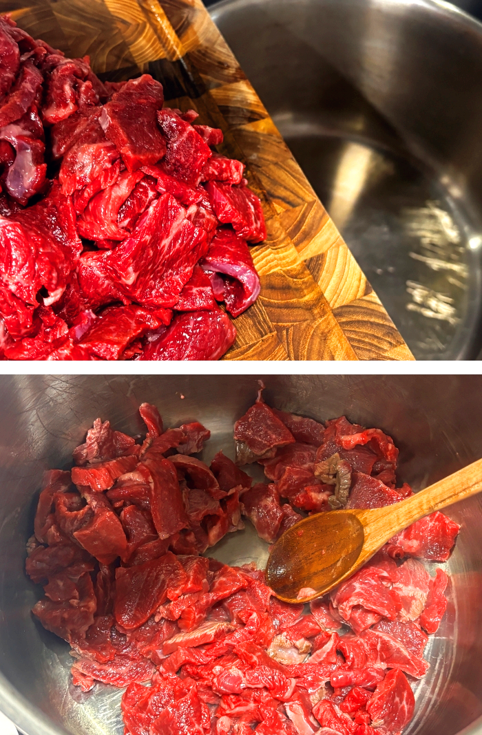 6. 예열된 냄비에 썰어 준비해 놓은 소고기를 넣어 볶아주세요.