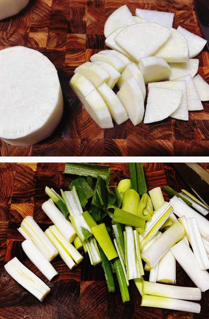 2. 씻어서 준비한 파와 무는 손가락 크기로 큼직큼직하게 무는 나박 썰기로 대파는 길게 반을 갈라 썰어주었어요.