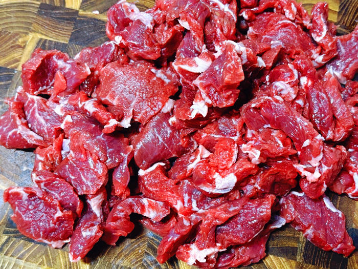 4. 소고기는 결을 잘라 끊어 주는 방향으로 썰어 준비해 주세요.