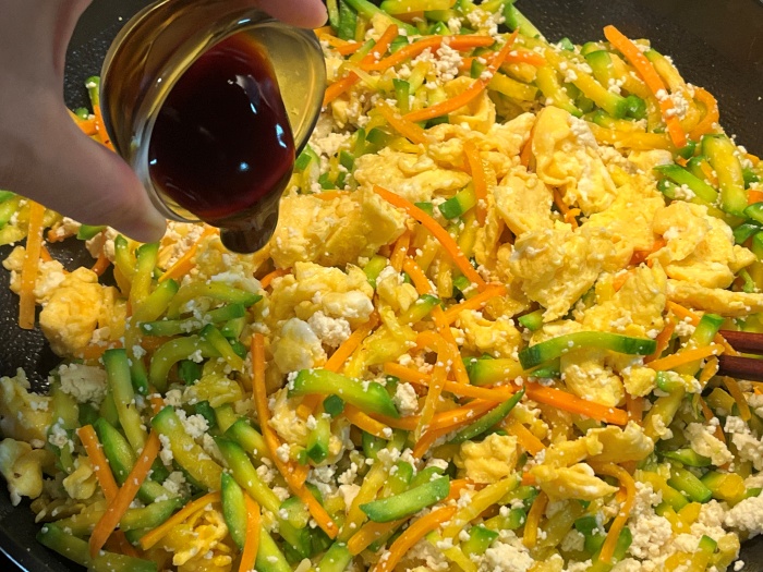먼저, 채 썬 당근을 소량의 오일을 이용하여 볶아주시고(오일은 최소한으로 사용하시길 추천드려요) 당근이 절반 정도 볶이면 준비한 애호박을 넣어 함께 볶아주세요, 이때 다진 마늘을 넣어서 함께 볶아주세요. 그리고 물기 짠 두부와 계란스크램블의 순서로 다 함께 볶아주세요.
