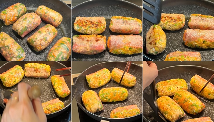 10. 그런데 기름에 살짝 튀기듯 구워주면 또 얼마나 더 맛있게요. (구워줄 때는 말아서 살짝만 라이스페이퍼에 수분이 마르게 놔뒀다가 구우시는 게 만두가 서로 덜 붙어서 굽기가 편하세요, 그리고 간혹 라이스페이퍼 중에 특히 얇은 제품이 있을 수도 있어요. 그러면 구울 때 터지기가 쉬운데요, 이런 경우엔 속을 넣어 말아준 다음 마른 부침가루에 굴려서 구워주면 안 터지게 구울 수 있어요, 참고하세요!)
