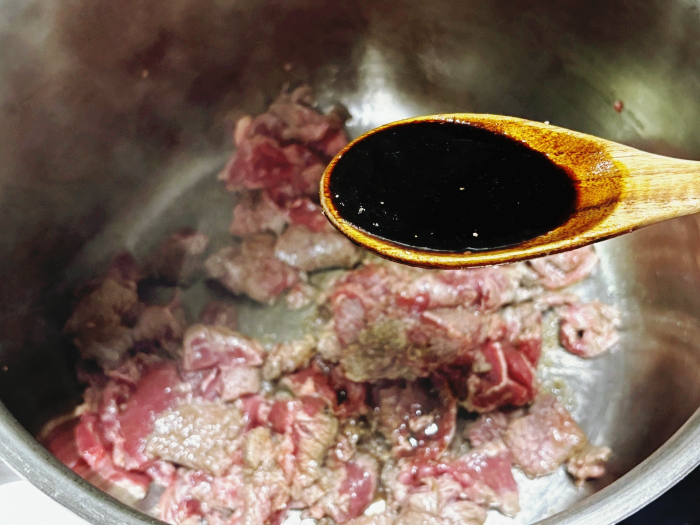 8. 그리고 국간장 한 큰 술 넣어 고기에 간을 밑간을 하여 볶아줍니다.