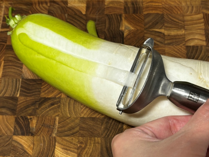 무는 겉의 흙을 털고 껍질을 필러로 벗기고, 대파는 흰 부분과 푸른 잎의 경계 부분까지 깨끗이 헹구어 준비해 주세요.