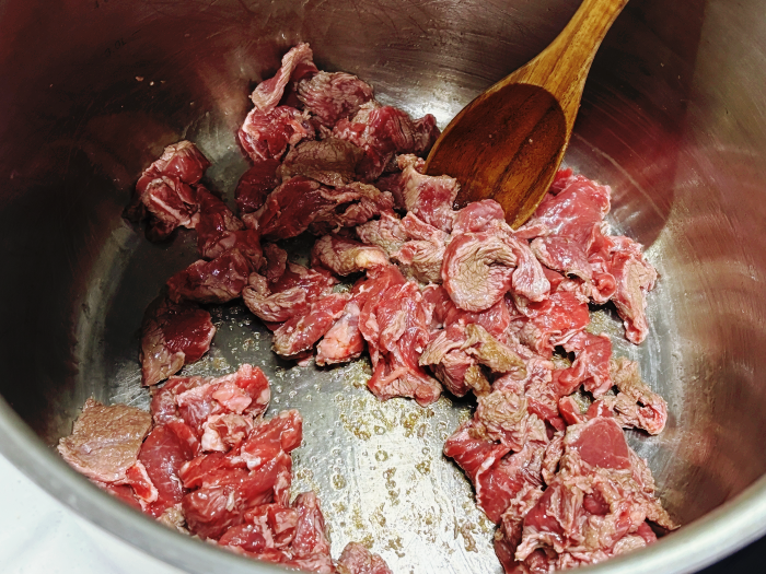 6. 예열된 냄비에 썰어 준비해 놓은 소고기를 넣어 볶아주세요.