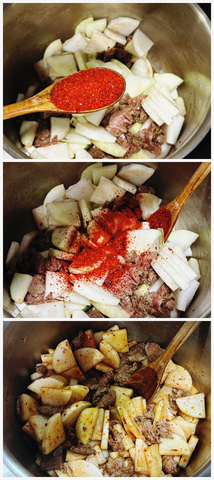 10. 소고기와 무를 볶으면서 준비한 고춧가루를 함께 볶아 고추기름을 내어줍니다. (무를 볶으면서 수분이 나오기 때문에 혹여 고춧가루가 타는 것을 방지할 수 있답니다