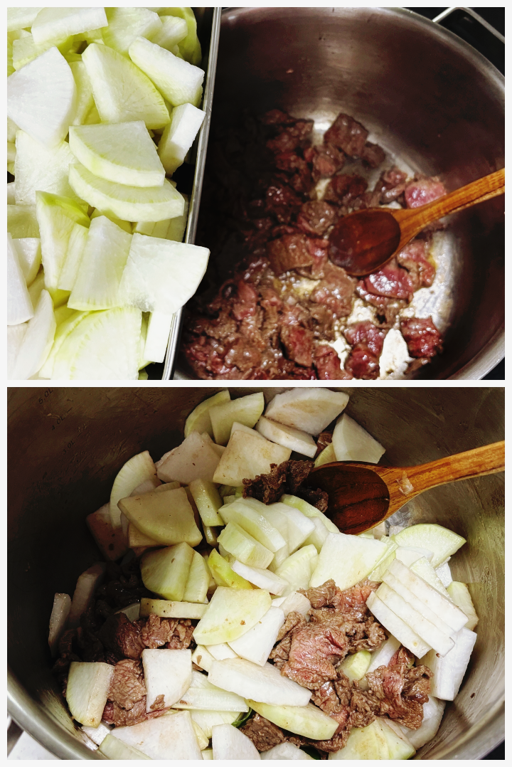 9. 소고기의 겉면이 살짝 익으면 썰어 준비한 무를 넣어서 한번 더 볶아주세요.