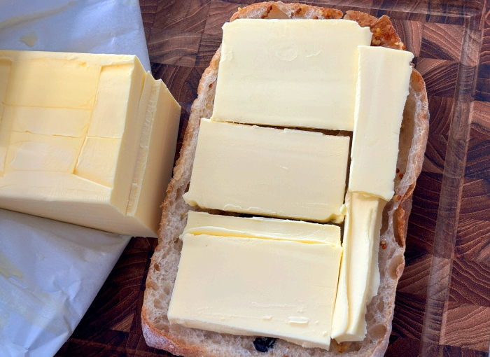 3. 버터를 넣어줄 거예요, 버터를 원하는 두께로 잘라 소스 발라놓은 빵에 얹어 주세요. (생각보다 도톰하게 넣어도 맛있어요, 윽! 살은 좀 찌겠죠!)