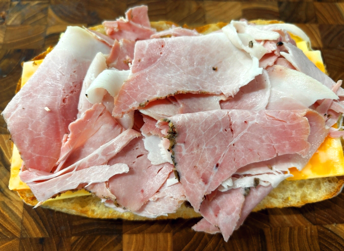 5. 잠봉을 준비해 주세요. 유셰프가 오늘 준비한 잠봉은 트러플 잠봉인데요, 짜지 않은 잠봉이라 넉넉히 넣어주었어요. 넉넉한 양을 겹쳐서 넣으면 식감이 훨씬 풍부해질 거예요. (유셰프가 사용한 잠봉은 트러플 시즈닝때문에 잘 찢어지는 잠봉이었는데, 찢어지지 않는 탄력 있는 햄이라면 삼등분정도로 말아 볼륨 있게 예쁘게 사용하세요)