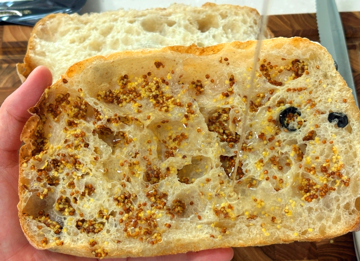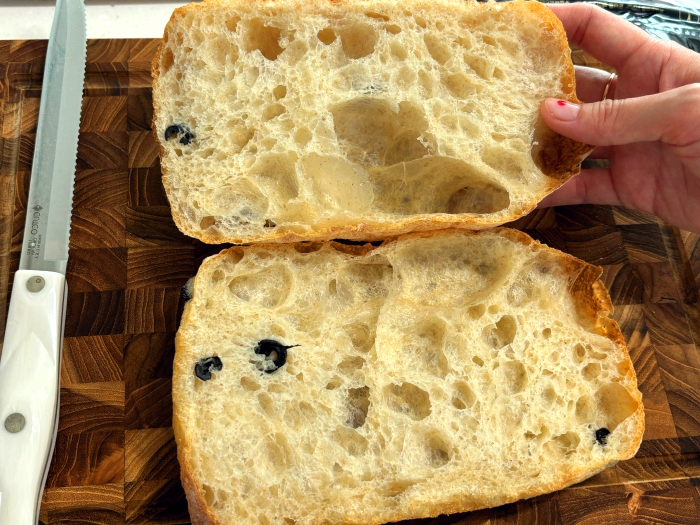 1. 먼저 치아바타, 바게트 등 사용하실 빵을 윗면과 아랫면으로 나누어 배를 갈라주세요. 치아바타 사용하였습니다.