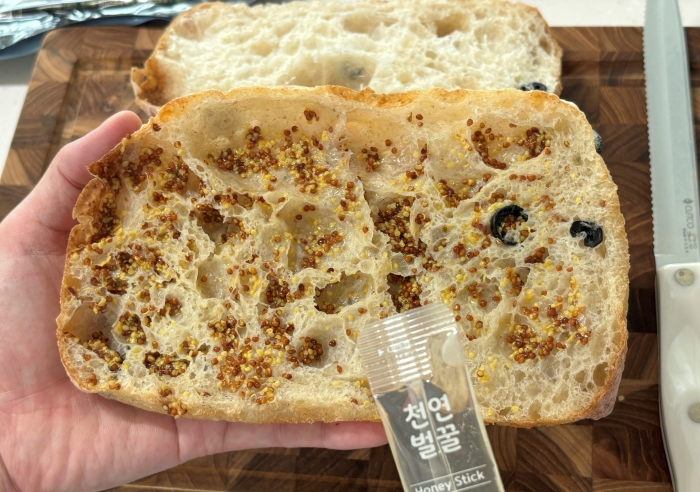 2. 가운데를 가른 빵의 속면에 홀그레인 머스터드와 꿀을 얇게 펼쳐서 골고루 발라주세요.