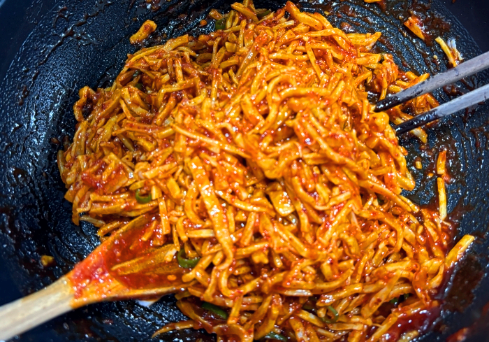 7. 넣어준 수분이 다 날아가고 양념이 졸아들면 불을 중 약불로 낮추고 마요네즈에 버무린 진미채를 넣어 고루 양념을 무쳐주고 잠깐동안 볶아주세요. 너무 오래 볶지 않아도 되세요. (양념을 버무려주는 정도면 충분해요, 불에 오래 볶으면 많이 딱딱해질 수 있어요)