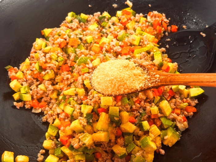 9. 이제 당근, 호박 그리고 양배추와 양파 순으로 썰어서 준비해 놓은 채소를 넣어서 볶아 줄게요.(볶는 중간에 설탕 한 숟가락 넣어주면 약간의 감칠맛을 줄 수 있어요, 저는 추가했지만 단맛을 좋아하지 않는다면 생략도 가능해요)