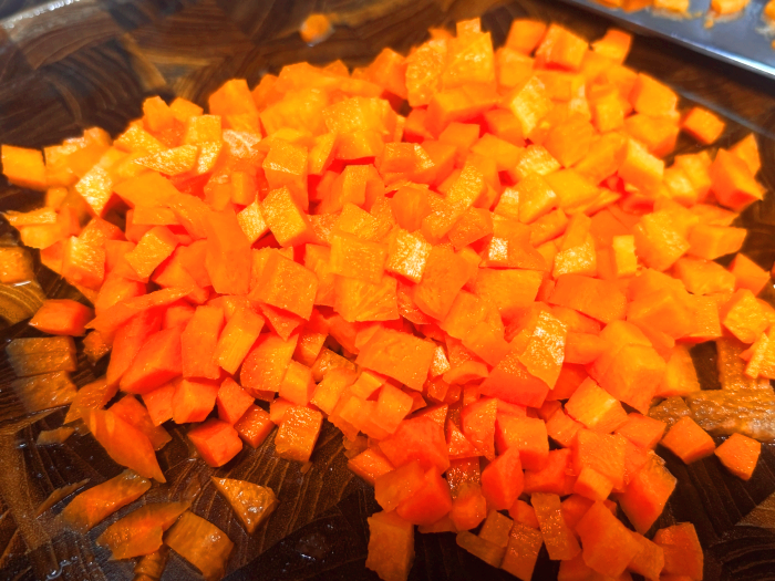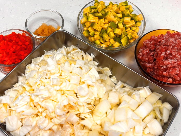 3. 그리고 호박, 양파, 양배추, 당근을 썰어서 준비해 주세요.(비교적 쉽게 물러져 작아지는 양파와 양배추, 호박, 당근 순으로 물러지는 채소를 좀 더 크게 썰어주면 볶아낸 후 채소의 사이즈를 비슷하게 맞출 수 있고 씹는 식감의 사이즈도 비슷하게 맞춰 줄 수 있어요)