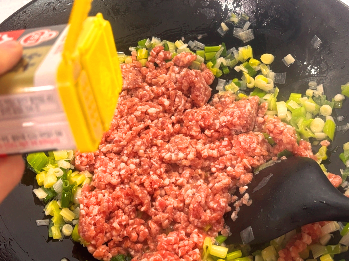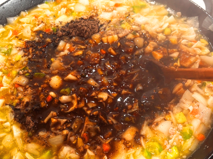 11. 물이 끓어오르면 분량의 짜장분말을 넣어서 풀어주세요. 뭉친 분말이 없도록 풀어가며 한소끔 끓여주세요.