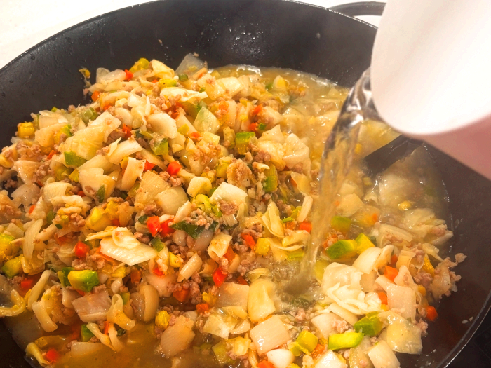 10. 채소가 전체적으로 섞이듯 겉면이 볶아진다 싶으면 분량의 물을 넣고 한소끔 끓여주세요.(물을 넣어 한번 끓여 낼 거라 많이 볶지 않아도 괜찮아요, 많이 볶지 않는 편이 오히려 채소의 식감을 살릴 수 있어요!