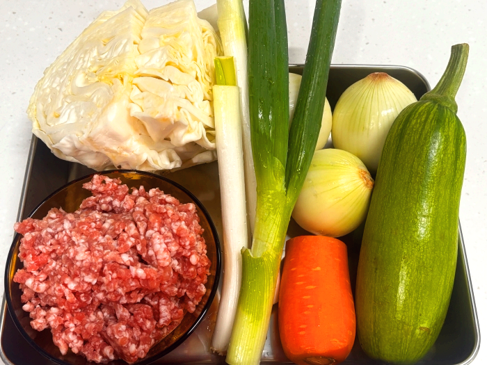 3. 그리고 호박, 양파, 양배추, 당근을 썰어서 준비해 주세요.(비교적 쉽게 물러져 작아지는 양파와 양배추, 호박, 당근 순으로 물러지는 채소를 좀 더 크게 썰어주면 볶아낸 후 채소의 사이즈를 비슷하게 맞출 수 있고 씹는 식감의 사이즈도 비슷하게 맞춰 줄 수 있어요)