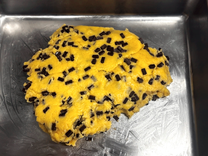 9. 다시 넓게 펼친 반죽 위에 초코칩을 올리고 한 곳에 뭉치지 않도록 골고루 섞어 다시 한번 반죽해 주세요.