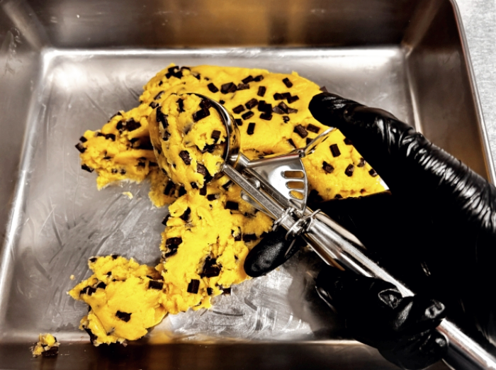 13. 팬에 올린 반죽을 스쿱퍼 뒷면을 사용해 적당히 눌러 모양을 잡아주세요. (견과류를 좋아한다면 추가하셔도 좋아요!)