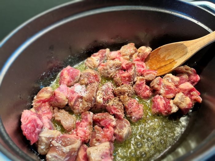 1. 소고기는 3cm × 3cm 사이즈로 깍둑썰기 해서 준비해 주세요. (열이 가해지면 고기는 사이즈가 작아져요, 재료들의 사이즈를 맞추어 보기 좋게 하기 위해서 채소보다는 조금 크게 썰어주세요)