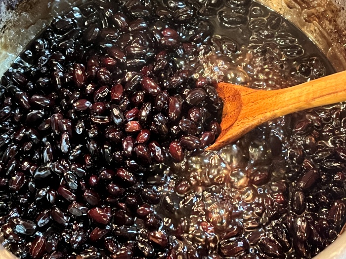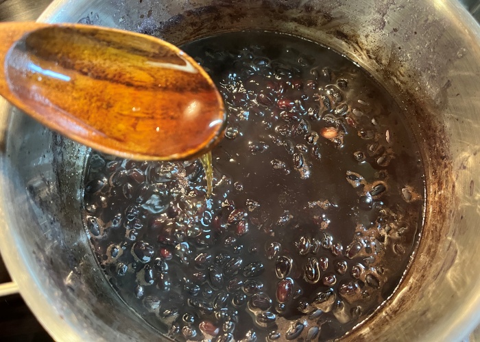 4. 삶은 콩을 만져보아 딱딱하지 않고 말랑해지면 양념을 해줄게요. 분량의 간장, 설탕, 맛술을 넣어주세요.