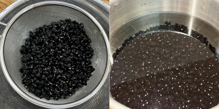 2. 불린 콩과 물을 체에 걸러 분리시켜 주세요. (콩 불린 물은 절대 버리시면 안 돼요, 검은색물에 영양이 많답니다)